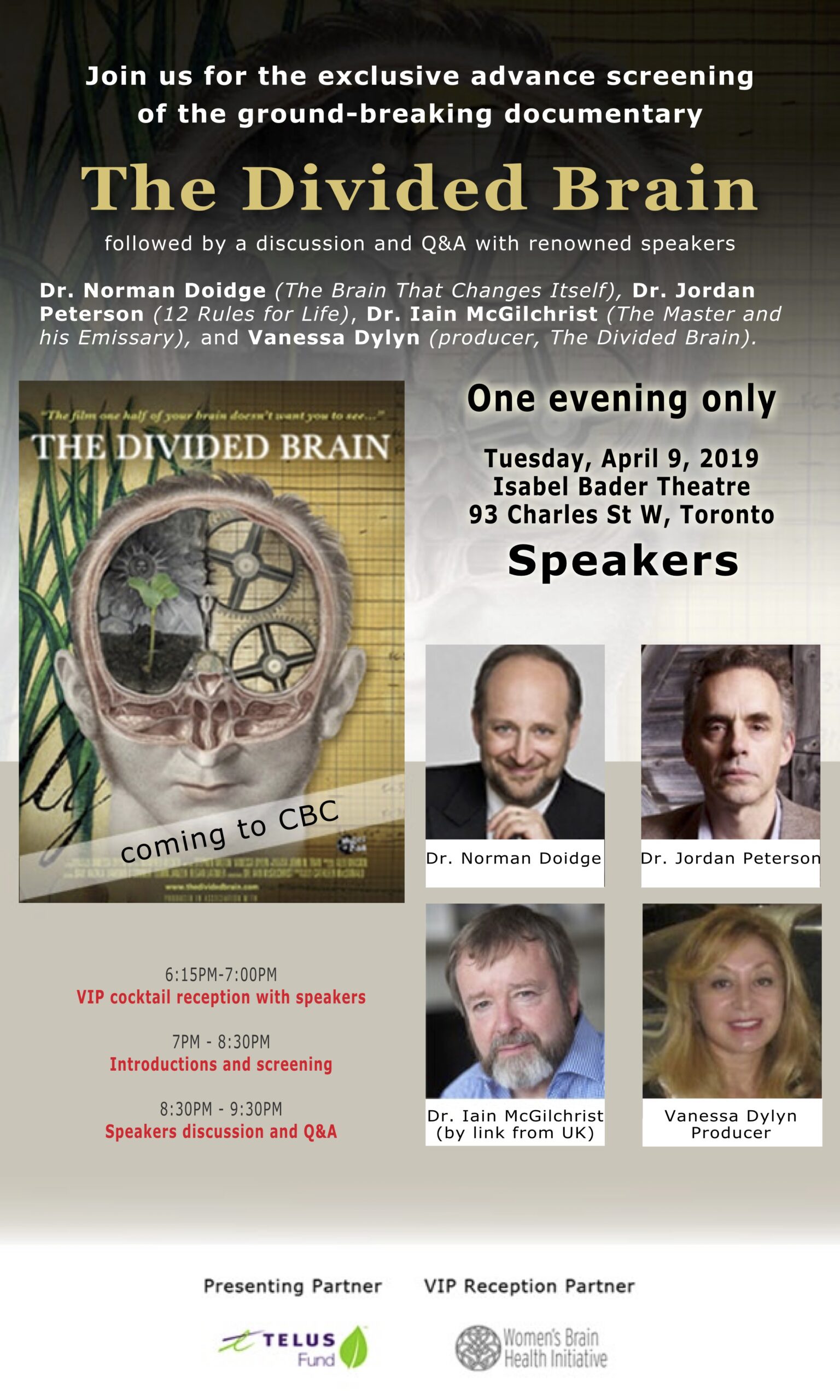 On April 9, 2019, an exclusive advance screening of The Divided Brain was held at Isabel Bader Theatre in Toronto featuring speakers Dr. Norman Doige, Dr. Jordan Peterson, Dr. Iain McGilchrist (by video link) and producer, Vanessa Dylyn.